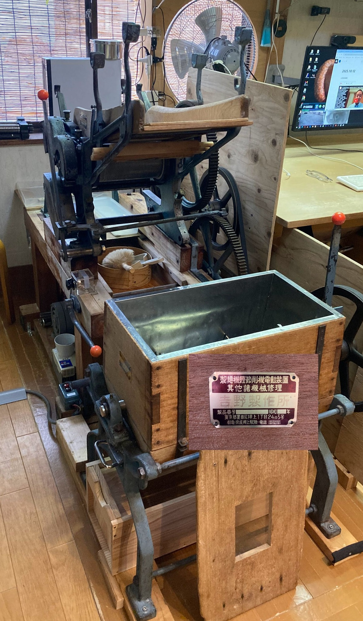 製麺機は昭和40年代に製作された年代物です。今でもこの型を使って製麺している老舗のそば屋は多くありますが、ほとんどは二八そばや三七そば(2割や3割が小麦粉のつなぎ入り)です。この型の製麵機での十割そばでの提供は稀です。